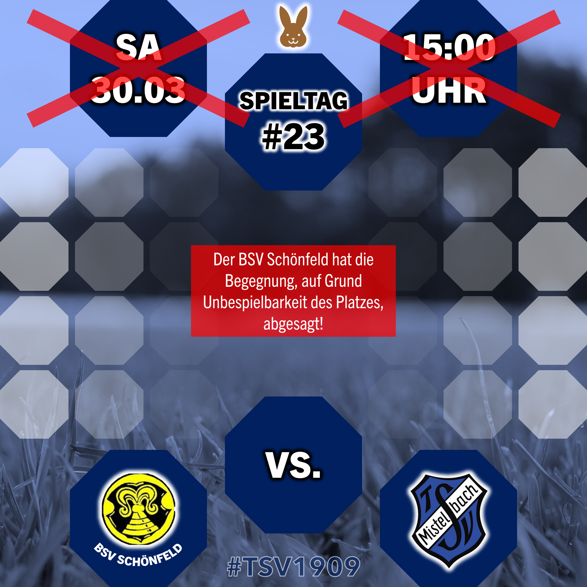 Der erste Teil des Osterwochenende wurde durch den Gastgeber BSV Schönfeld abgesagt. Der Platz sei nicht bespielbar und daher kann das Spiel am Ostersamstag nicht stattfinden. So wird am Osterwochenende nur einmal Fußball gespielt, am Ostermontag um 14 Uhr das Auswärtsspiel beim SV Lindenhardt.