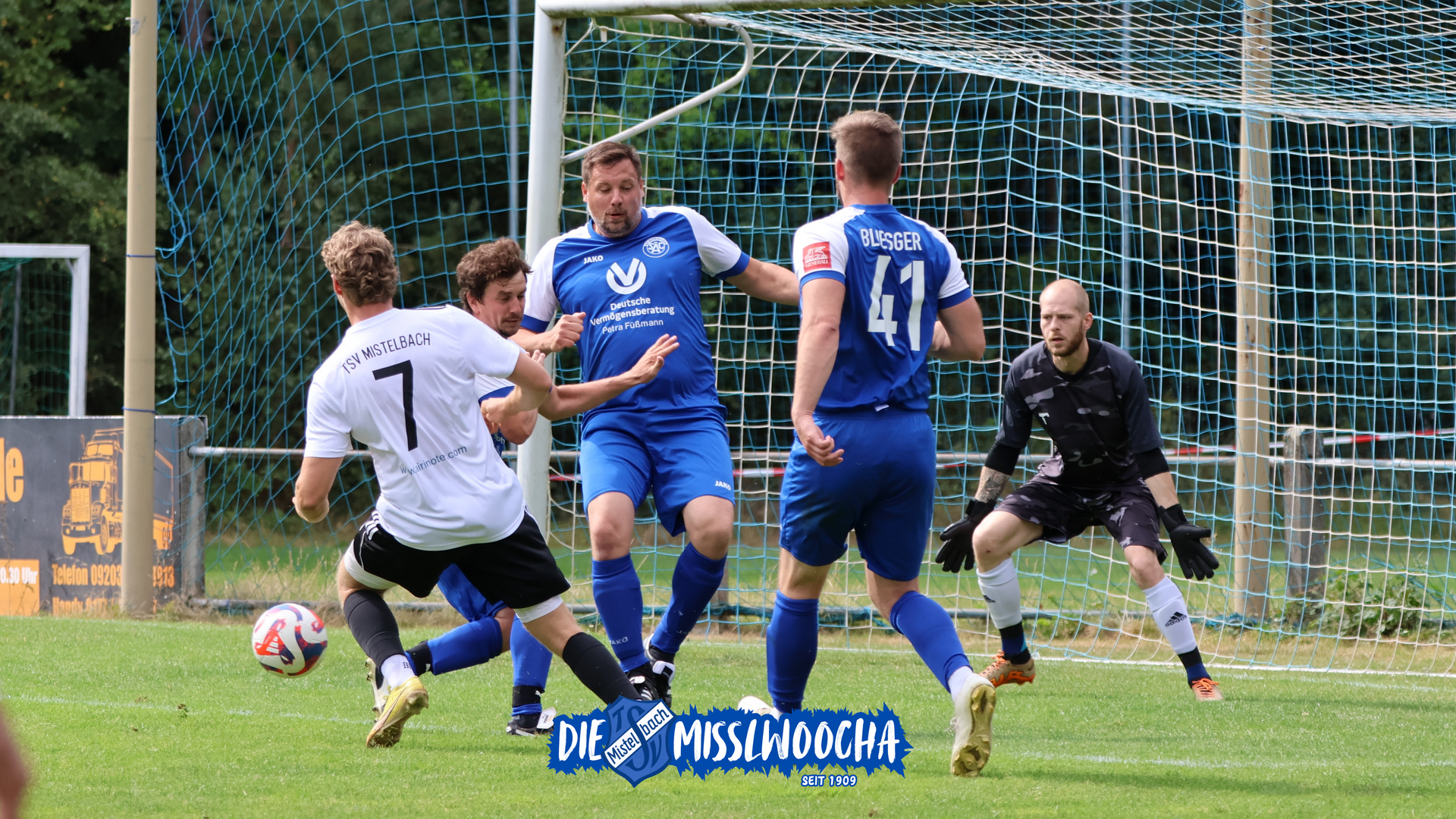 Bis zur Pause waren die Mistelbacher die spielbestimmende Mannschaft, jedoch war der Spielfluss durch zahlreiche Spielunterbrechungen, nach unter anderem einigen vermeintlichen Abseitsstellungen, gehemmt. Nach einem schönen Angriff über Nawzat Mohamad und Felix Pietzcker hätte Luca Leicht am Fünfmeterraum abschließen können, er legte jedoch quer zu Milend Boum, der den Ball nicht im Tor unterbrachte. Kurze Zeit später versuchte Luca Leicht mit einem Schuss aus 25 Metern den Torwart zu überwinden. Dieser konnte jedoch den Ball zur Ecke klären. Diese Ecke fand den Weg zu Michael Wienert, dessen Kopfball über dem Tor landete. Aufreger in der letzten Minute der regulären Spielzeit in Halbzeit eins. Felix Pietzcker wird im Strafraum von den Beinen geholt, der fällige Pfiff blieb jedoch aus.