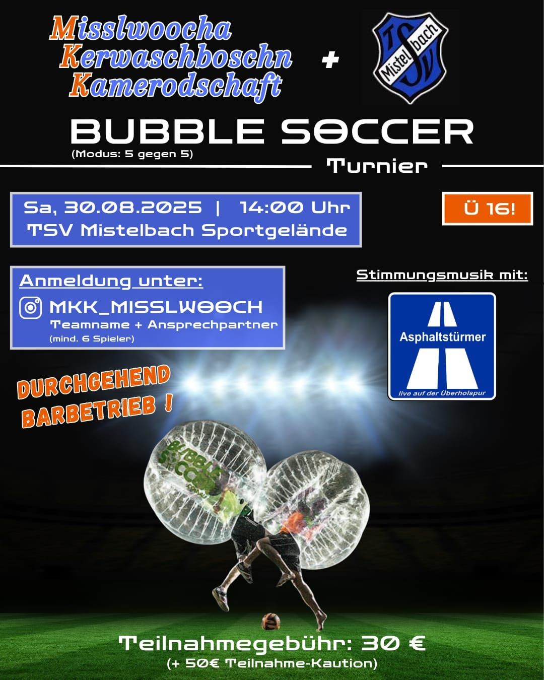 Die Misslwooche Kerwa 2025 wirft schon ihre Schatten voraus. Zusammen mit der Misslwoocha Kerwaschboschn Kamerodschaft (MKK) findet am Kerwasamstag, den 30. August 2025, ein Bubble-Soccer-Turnier statt. Das Turnier beginnt um 14 Uhr auf unserem Sportgelände. Gespielt wird im Modus fünf gegen fünf. Für ein Team braucht ihr mindestens sechs Ü16-Spieler. Anmeldung läuft über die MKK bei Facebook und Instagram, oder ihr nehmt zu uns Kontakt auf (kontakt@tsv-mistelbach.de).