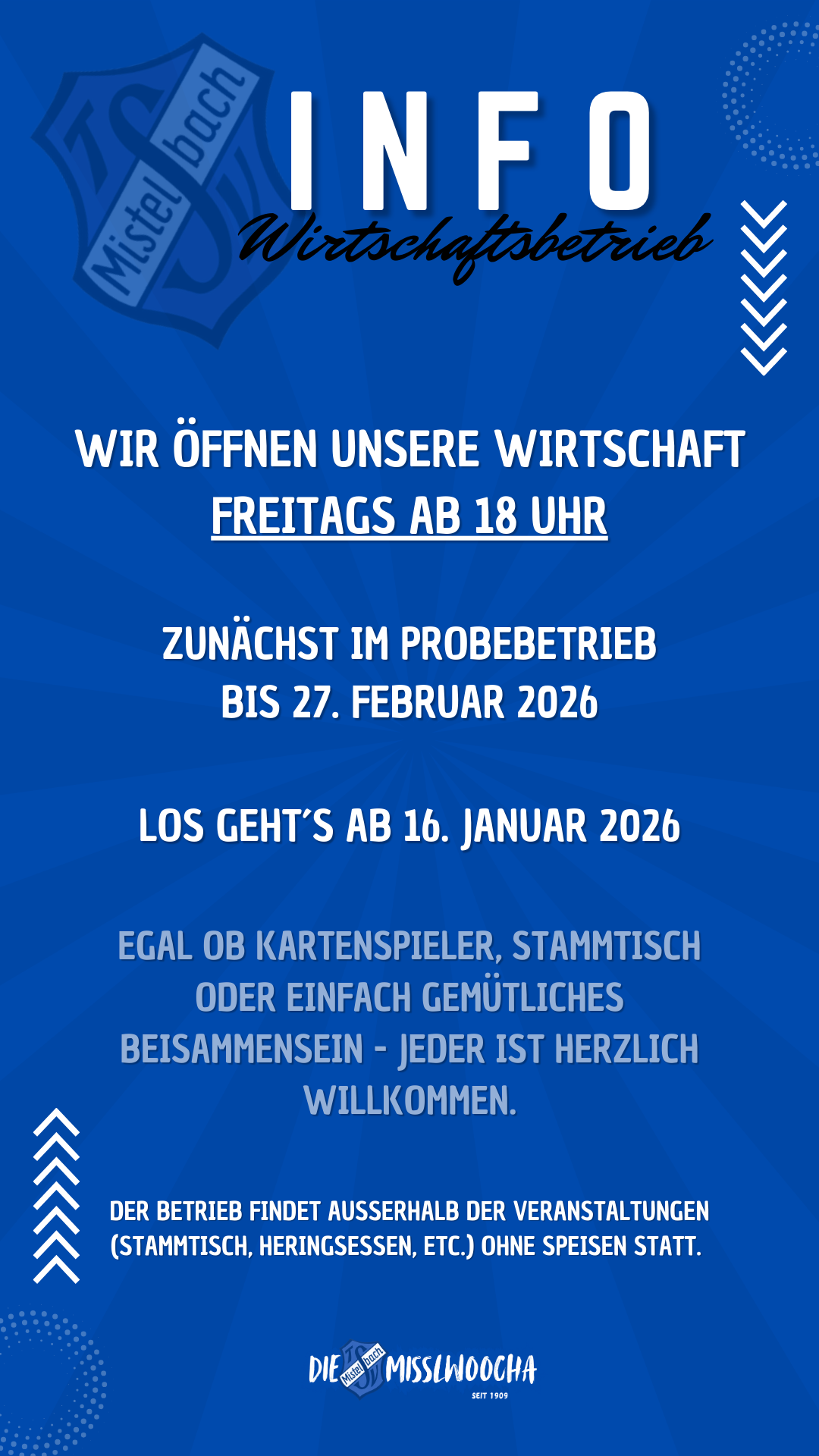 Deshalb öffnen wir ab Freitag, 16. Januar 2026, unsere Vereinswirtschaft im Sportheim – jeden Freitag ab 18:00 Uhr. Der Betrieb ist zunächst als Probebetrieb bis einschließlich 27. Februar 2026 geplant.