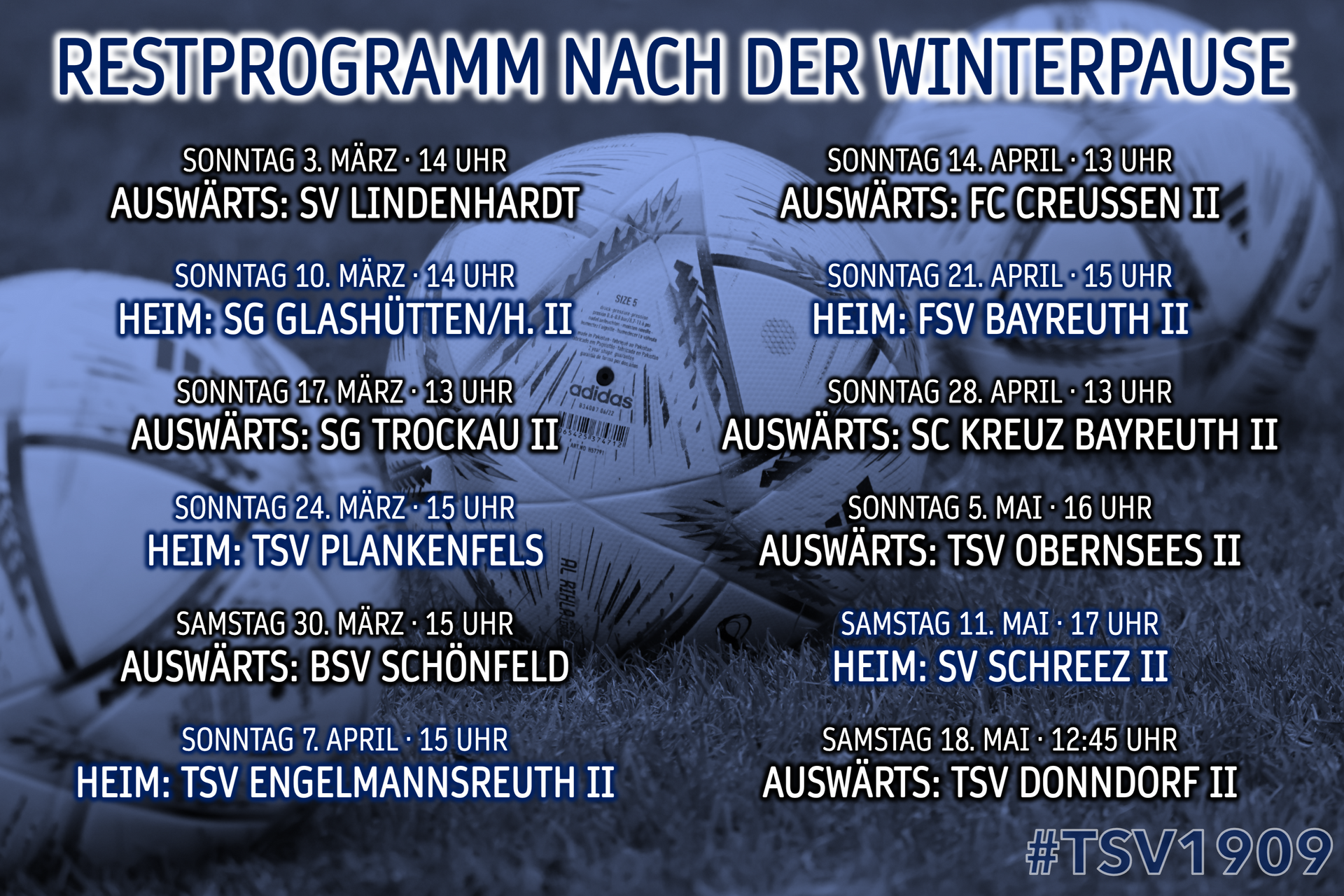 Zwölf Pflichtspiele stehen in dieser Spielzeit noch aus. Den Anfang machen die beiden Nachholspiele beim SV Lindenhardt (3. März) und gegen die SG Glashütten/Hummeltal II (10. März). Die letzten beiden Spieltage finden in der A-Klasse zur Entzerrung des Spielplan jeweils Samstags statt. Unser letztes Heimspiel findet ihm Rahmen des diesjährigen Sportfestes (11. Mai) statt. Gegner ist um 17 Uhr der SV Schreez II. Den Abschluss macht am 30. Spieltag das Auswärtsspiel beim TSV Donndorf/Eckersdorf II (18. Mai).